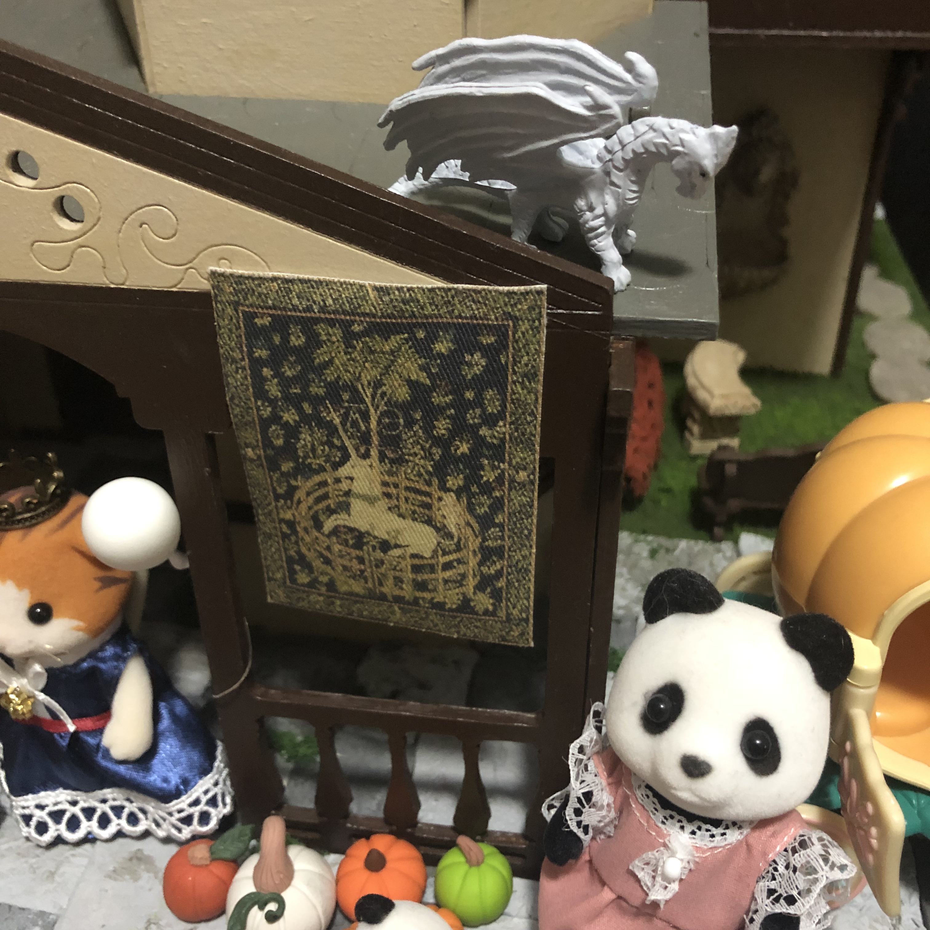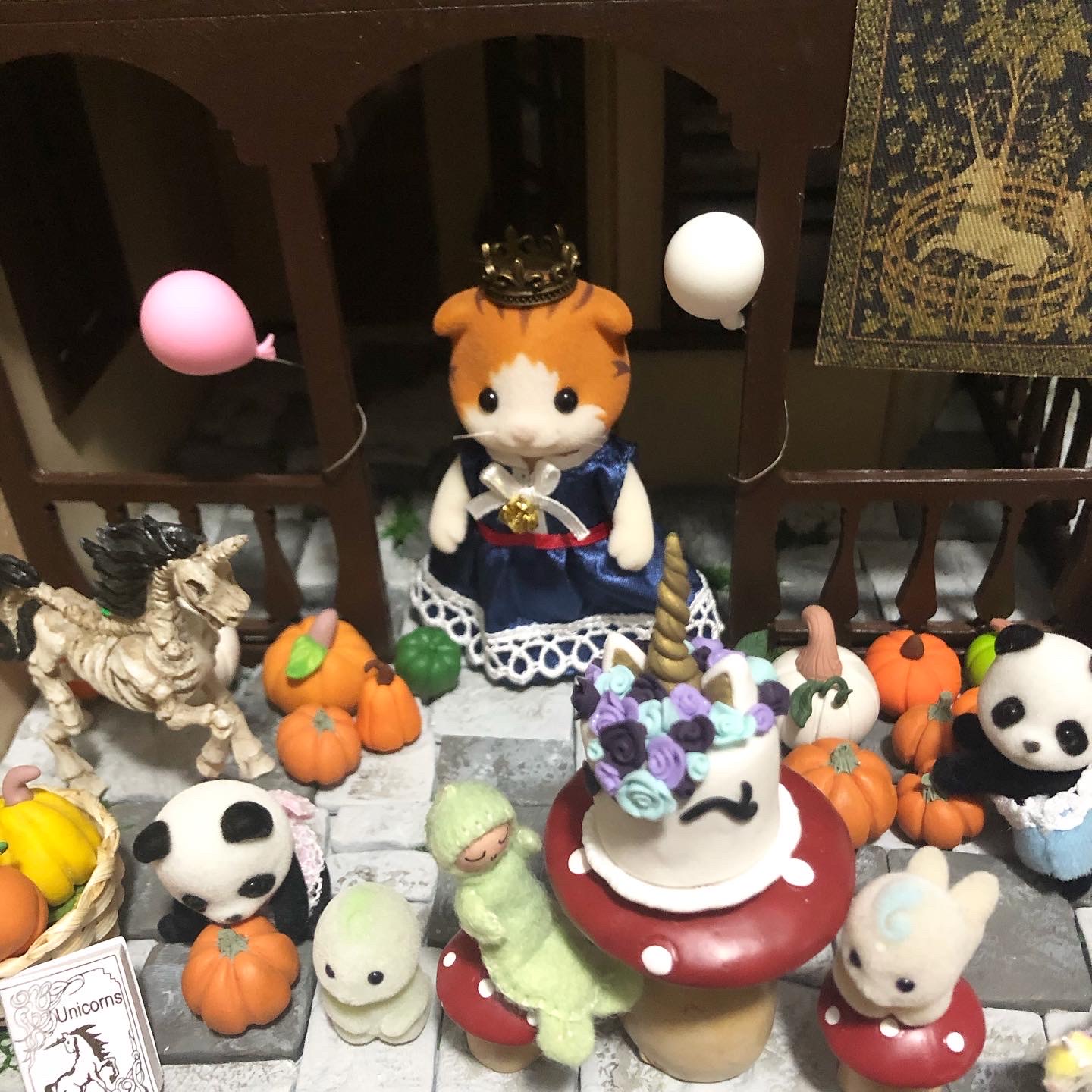 Those little balloons on the pumpkin cart are from a dear friend, and two of the three brooms are from CatzillasMinis. The big table in the middle was made by me, and the bridge, hay bales, baskets, white chairs and table, unicorn, black tree, and autumn leaves are all from Michaels craft store.