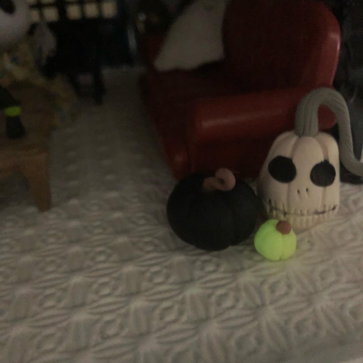 The Pandas’ home is always a little spooky, but they’ve added some glow-in-the-dark pumpkins to their living room to spice it up for Halloween. I used glow-in-the-dark polymer clay for these. I made a Zero from Nightmare Before Christmas using this clay as well, but Michael loves him, so he took him to his office before I could get any pictures.