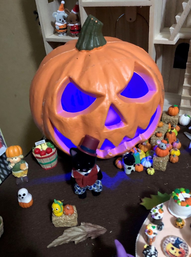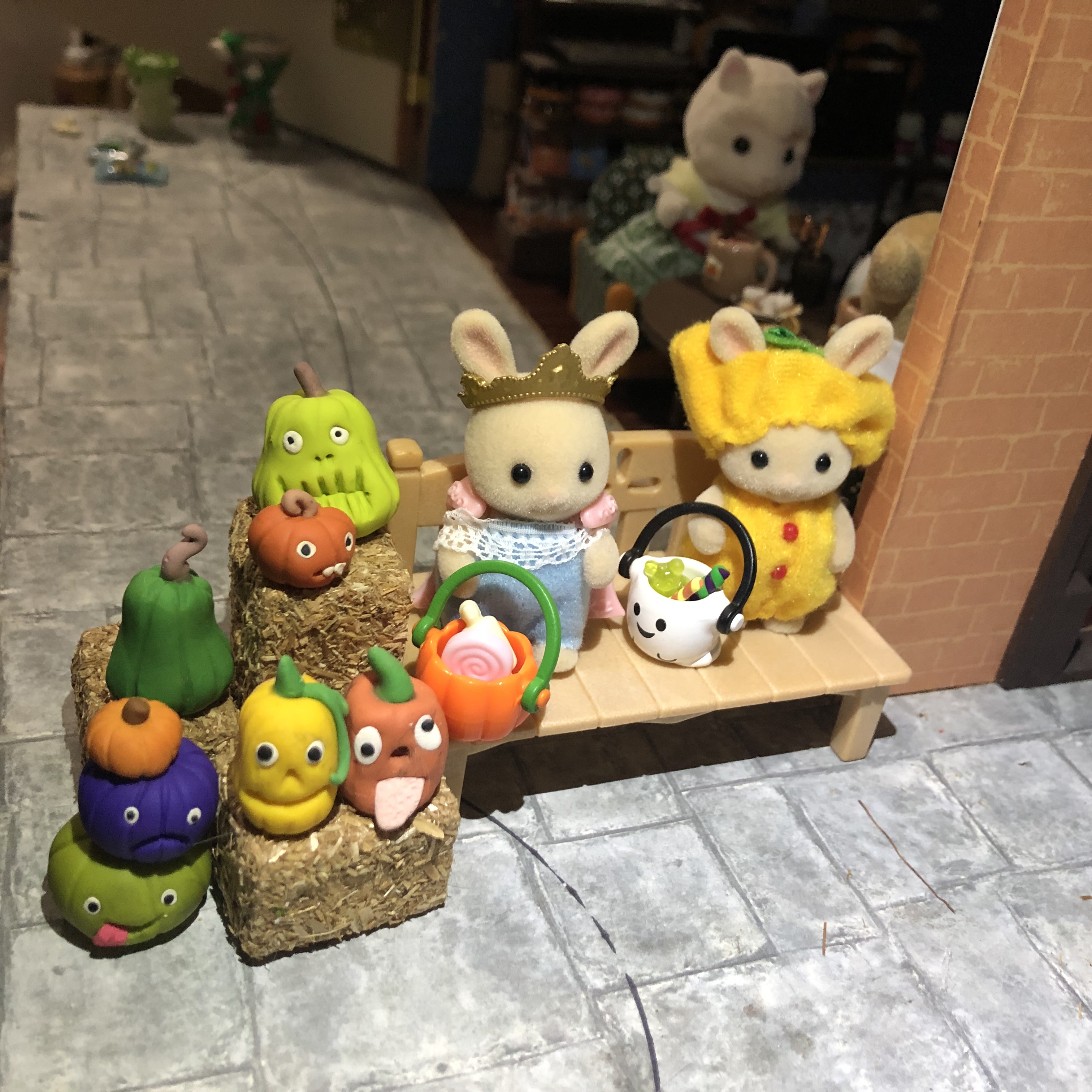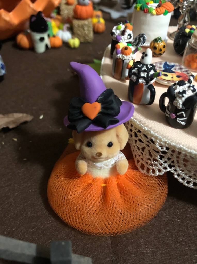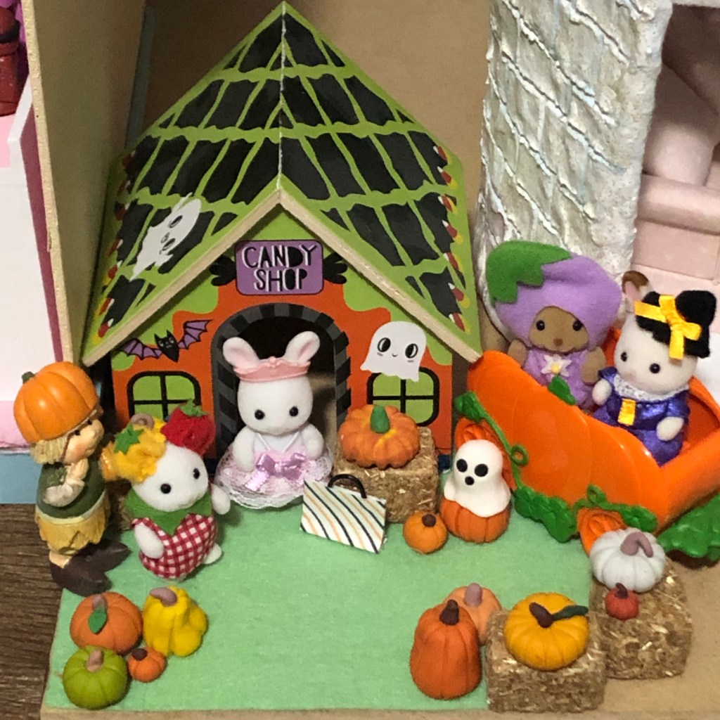 Mushroom Meadow is all ready for Halloween this year! Below is a the pumpkin patch I set up for the Calico Critter babies. All the pumpkins were made by me using polymer clay. The Candy Shop is from Target, and the weird pumpkin man was from a dollar store in Houston. The pumpkin wagon is a Calico Critter accessory. I’m obsessed with the tomato baby next to the princess bunny. She has little tomatoes on her ears, and it’s just so cute!