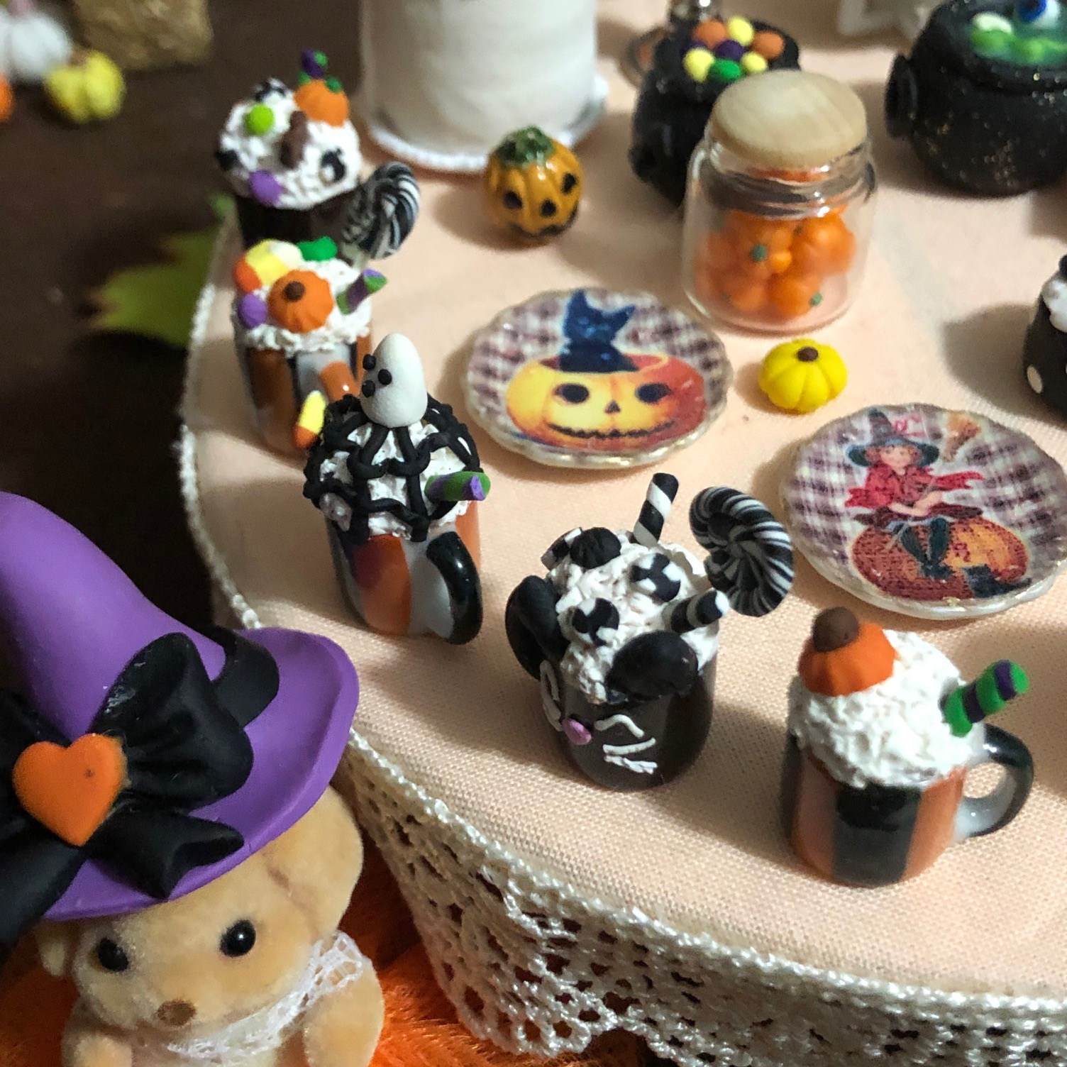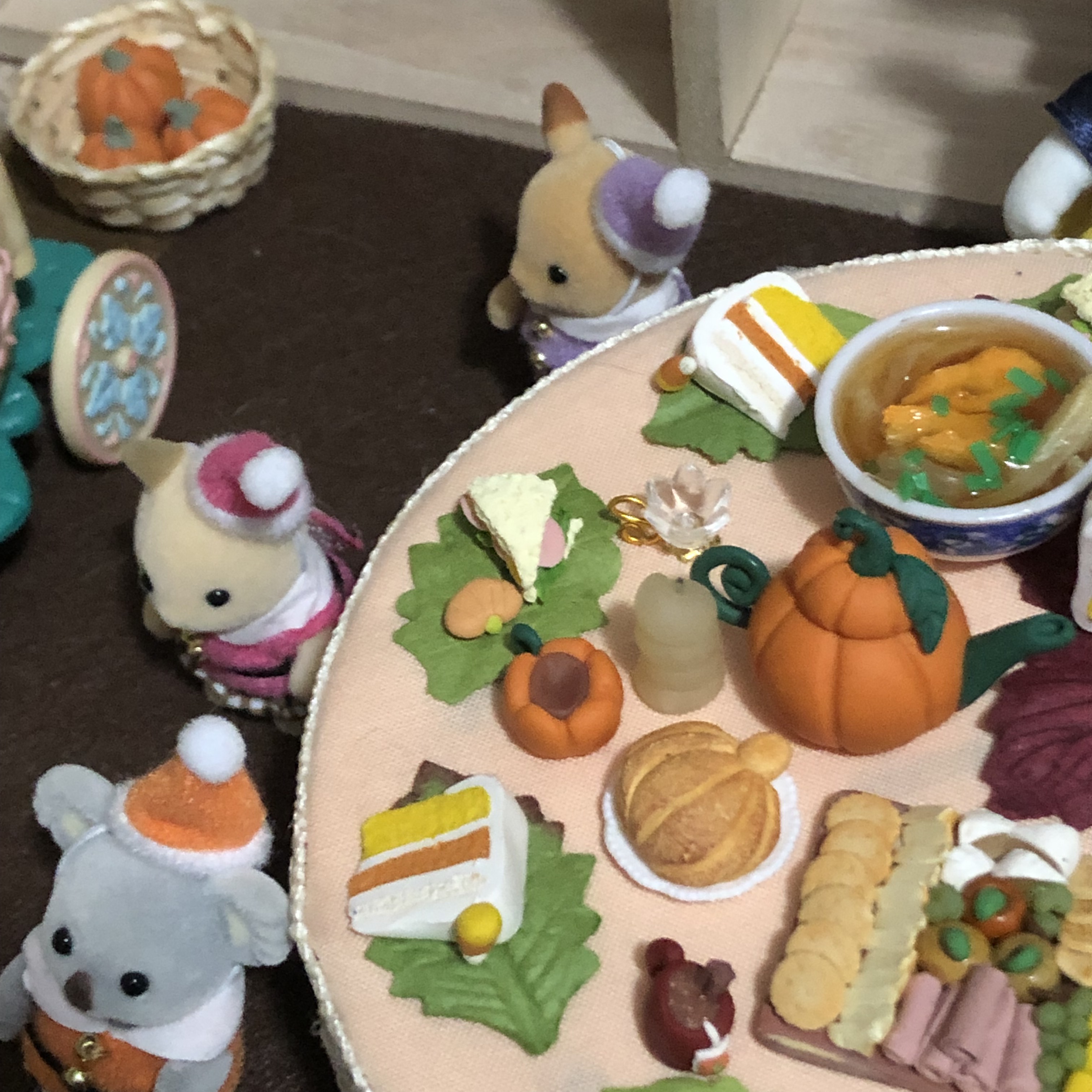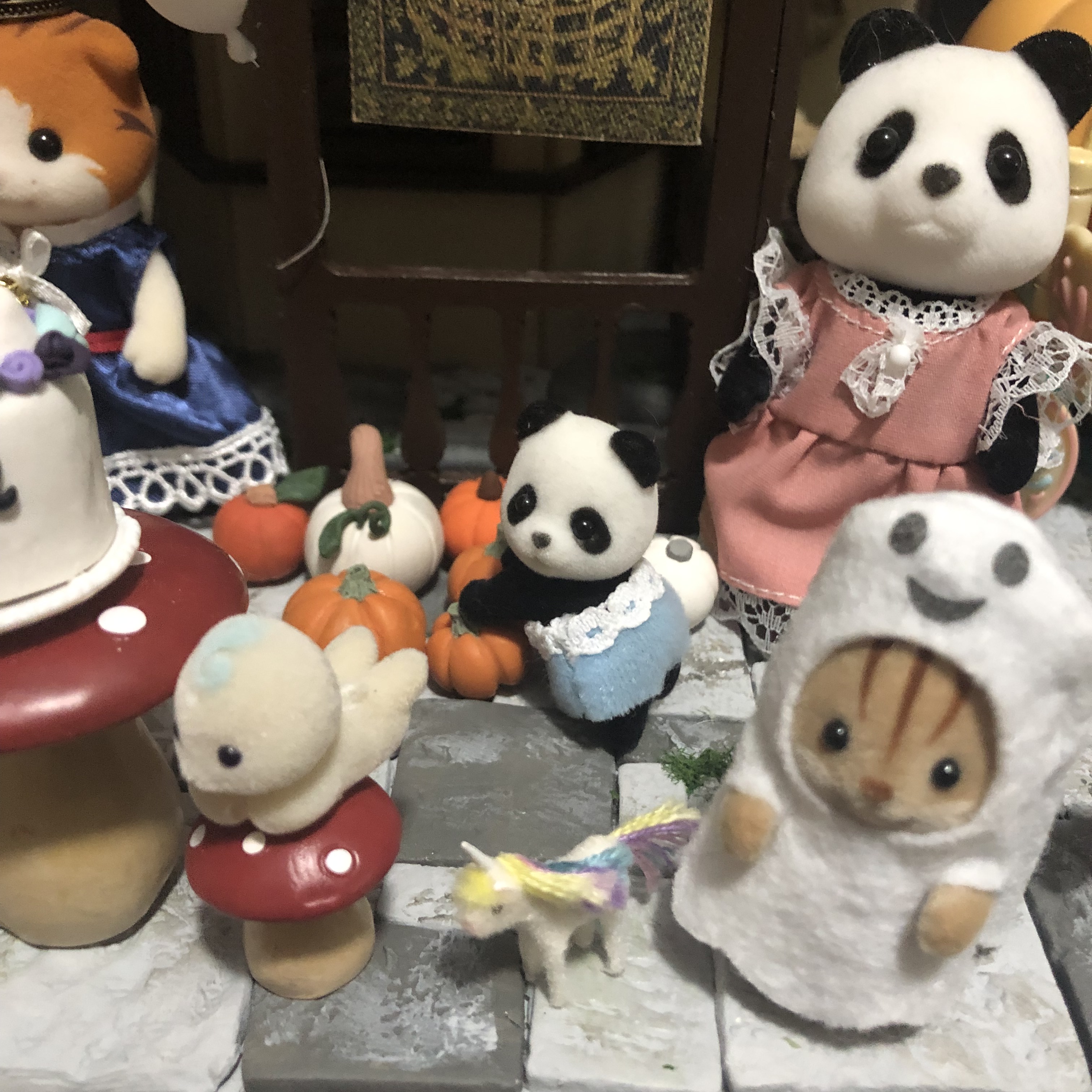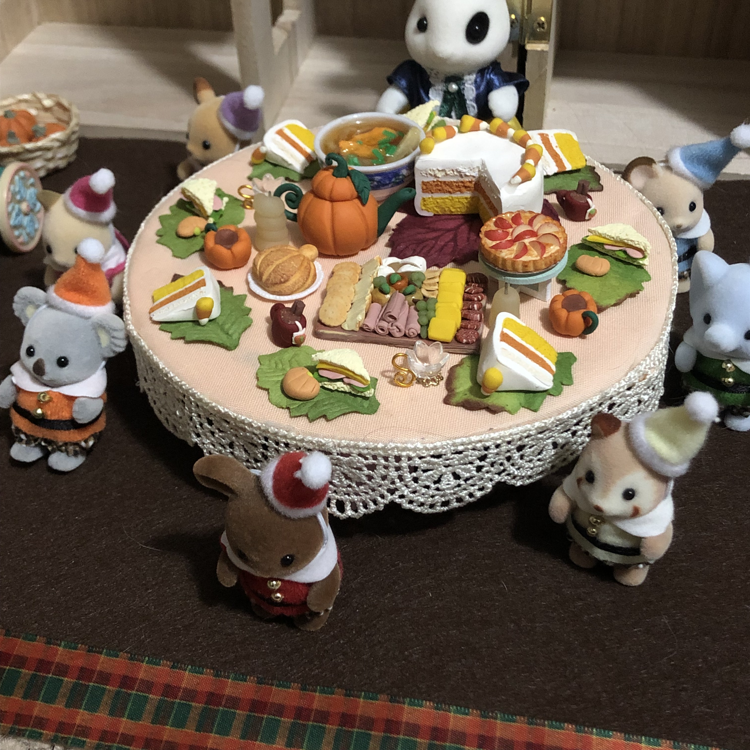 Mushroom Meadow is all ready for Halloween this year! Below is a the pumpkin patch I set up for the Calico Critter babies. All the pumpkins were made by me using polymer clay. The Candy Shop is from Target, and the weird pumpkin man was from a dollar store in Houston. The pumpkin wagon is a Calico Critter accessory. I’m obsessed with the tomato baby next to the princess bunny. She has little tomatoes on her ears, and it’s just so cute!