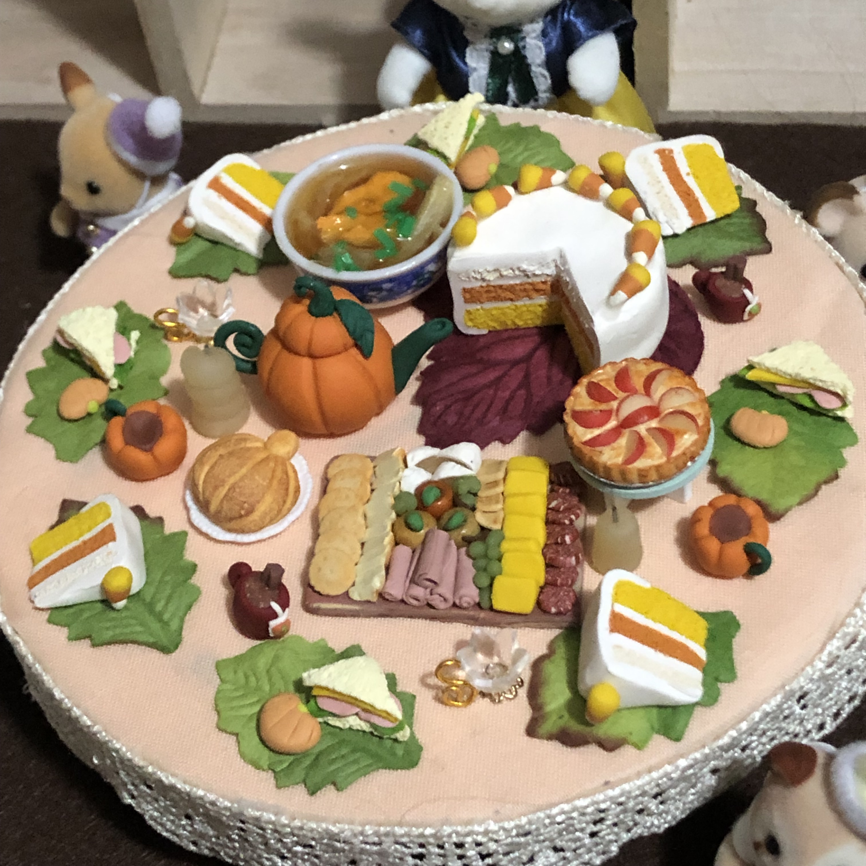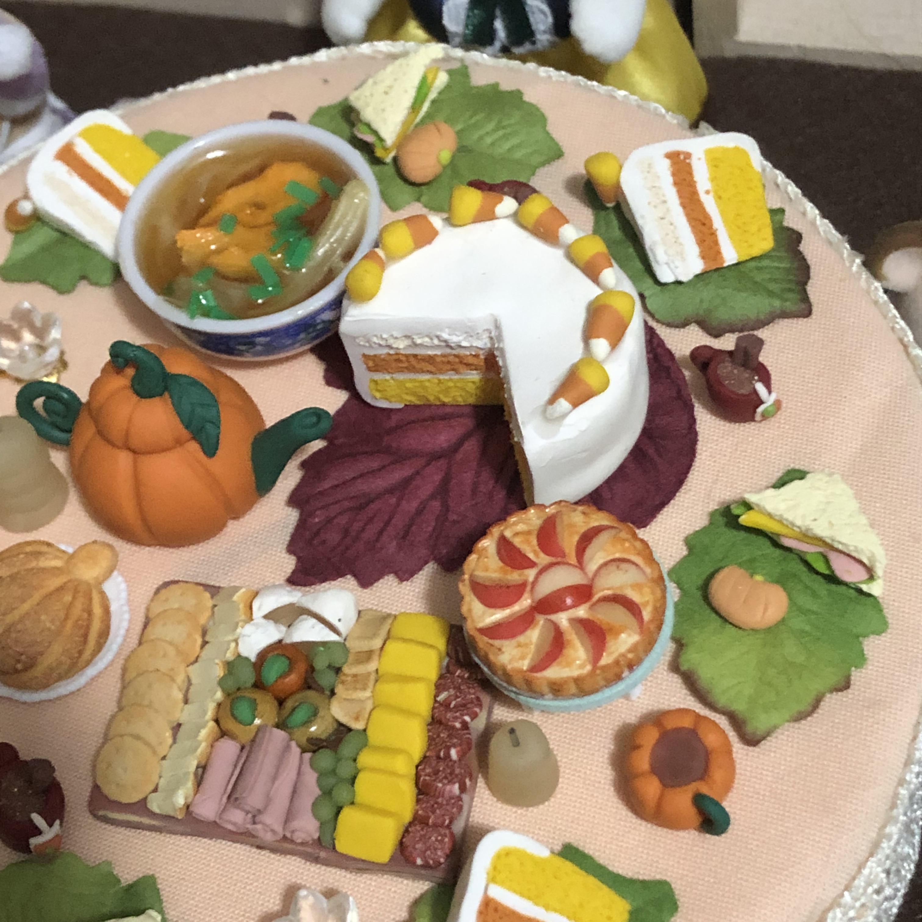 I also made my first ever polymer clay charcuterie board for this party. Most of the food was made by me except for the soup and the apple pie. The apple pie was a gift from the lovely friend who hosted this tea party, and the soup was purchased on eBay.