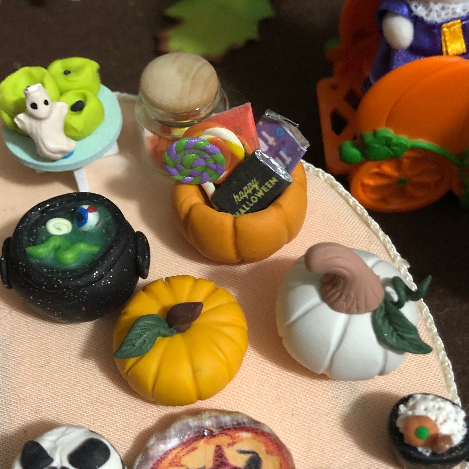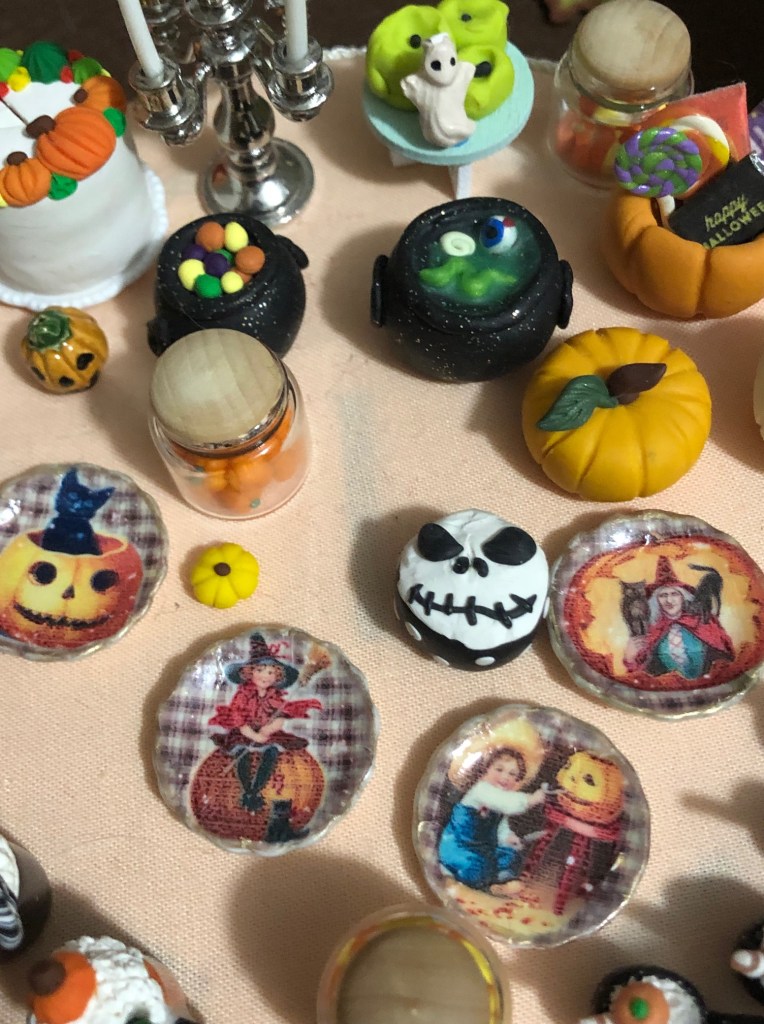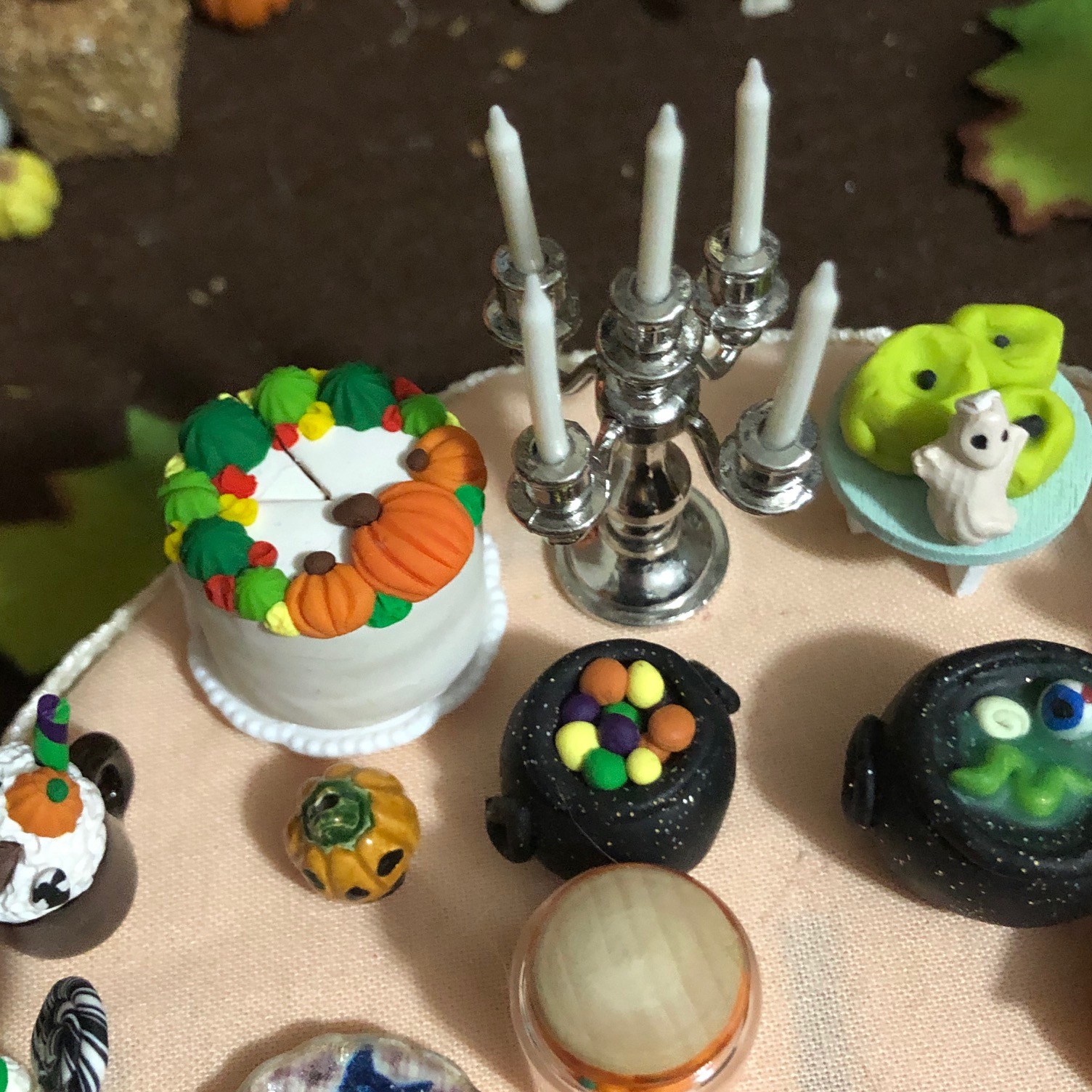 I love decorating tables. I don’t know why. I just find it so fun. The Jack Skellington cake and cauldrons are polymer clay, and I made them. I also made the pumpkins and the green candles.