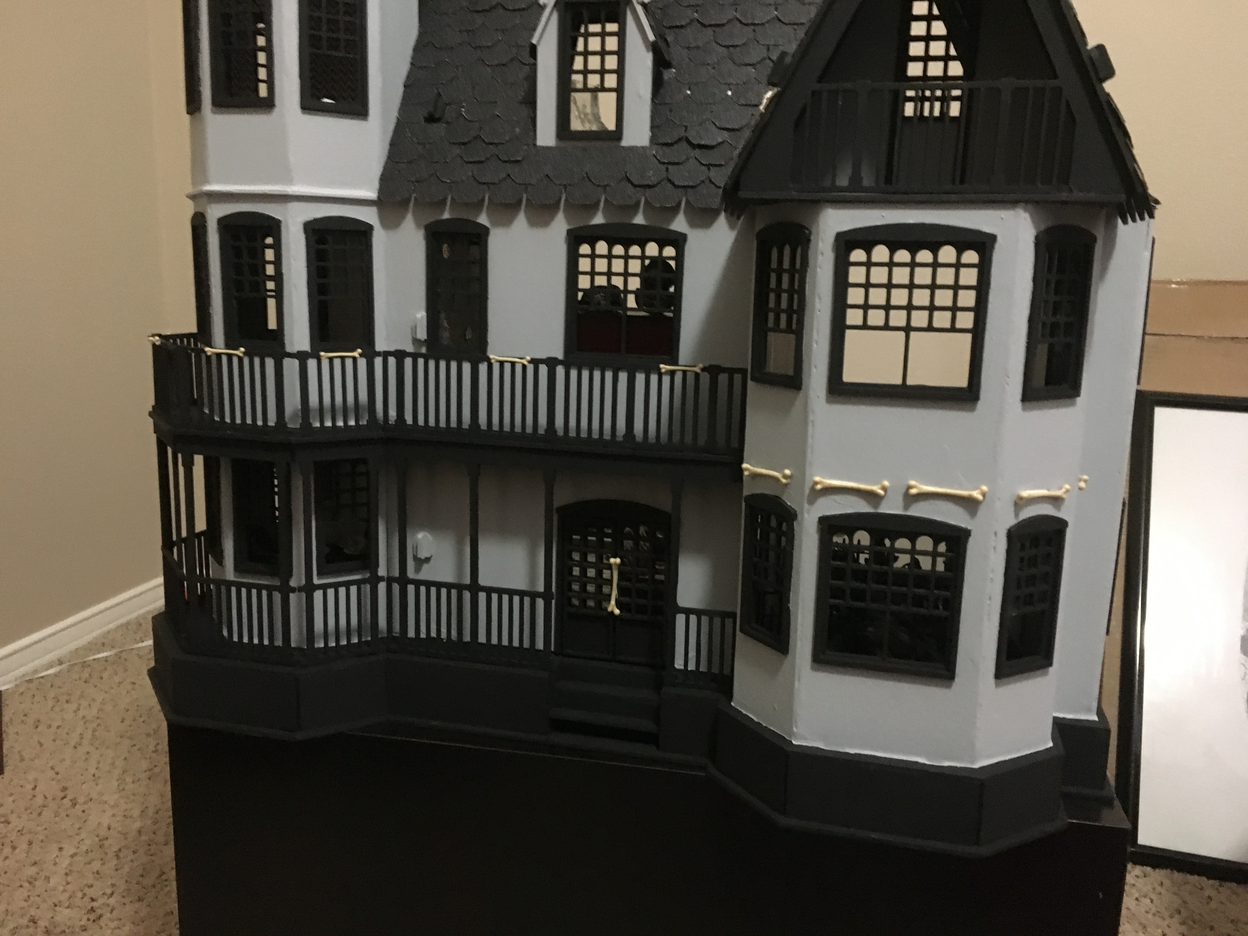 The Panda house is the third dollhouse I built, and I finished it in early 2019. The outside is grey and black, and the inside has a black and white theme.
