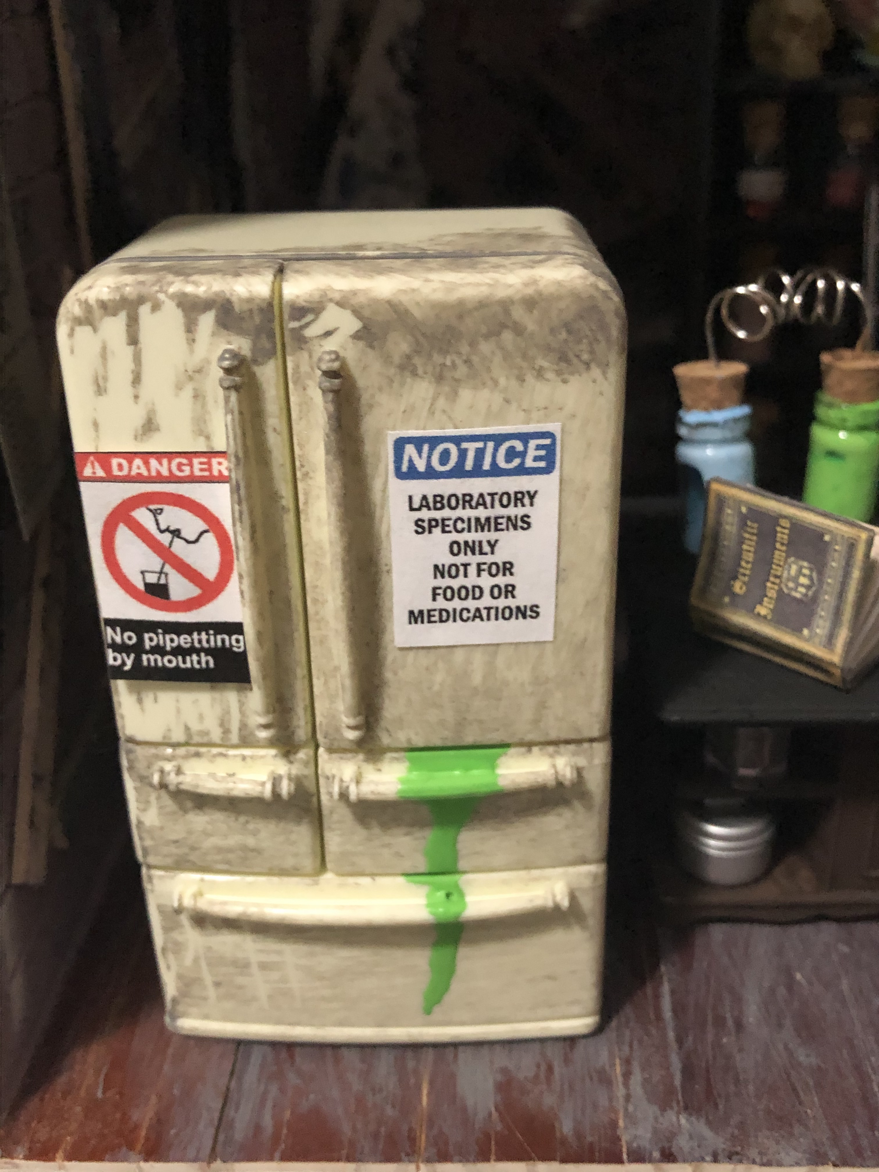 Dr. Oreo and Dr. Midnight are such rulebreakers. They have signs right in front of them that say not to have food in the lab, but they’re always eating. This is a Calico Critter fridge that I painted on to make it look worn and like maybe some lab explosions had happened near it (or inside it). That sandwich is oozing.