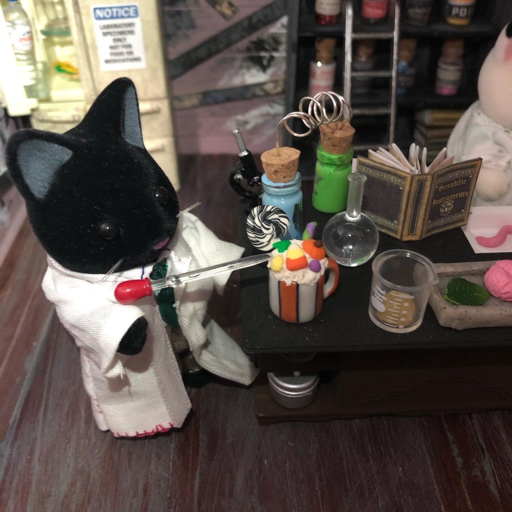 They have books, a laboratory fridge, an eyewash station, and plenty of beakers. I stitched their lab coats myself. I want to make them some new ones soon though. Also, as you can see in the above photo, Dr. Oreo and Dr. Midnight are not afraid to eat in the lab (even though they really shouldn’t be doing that).