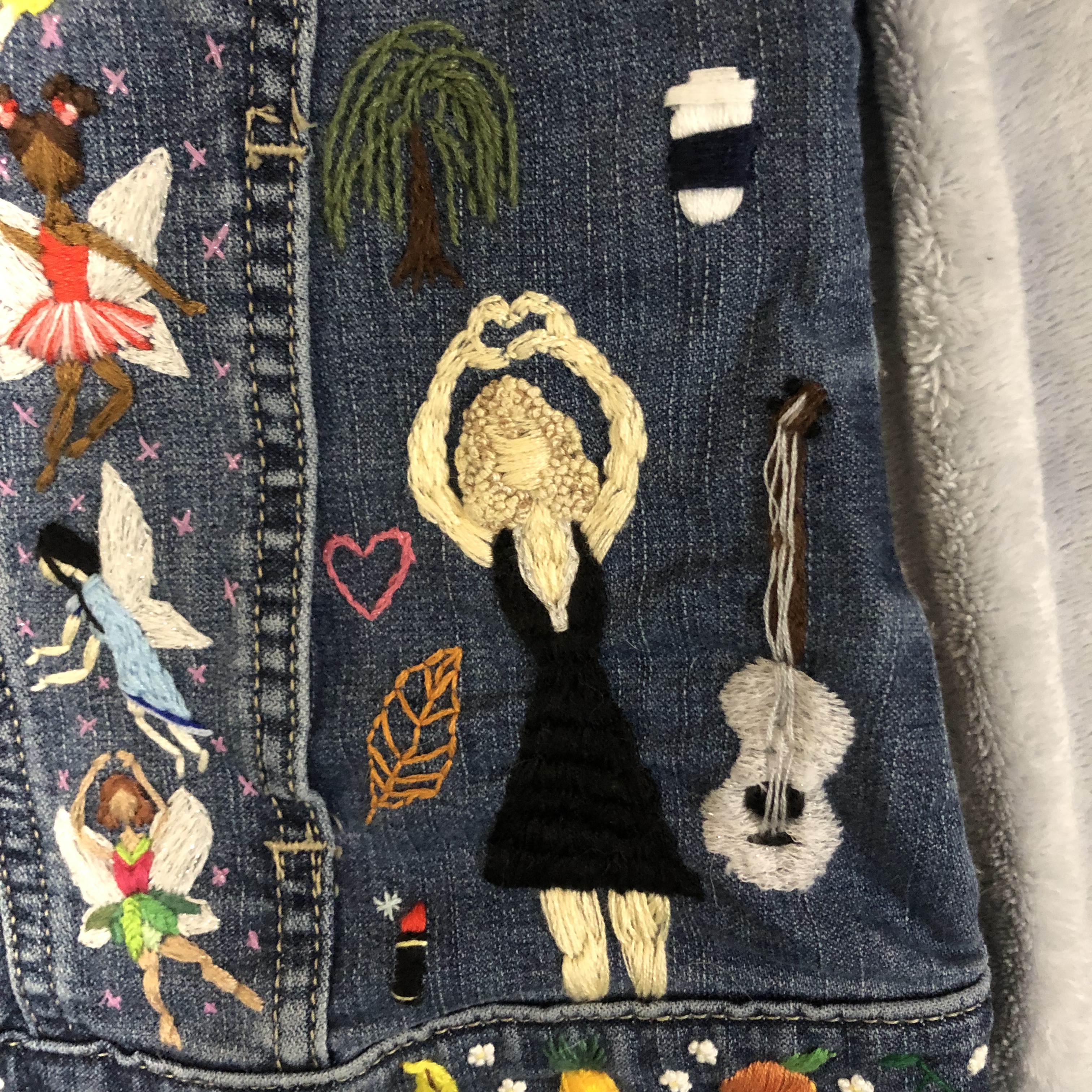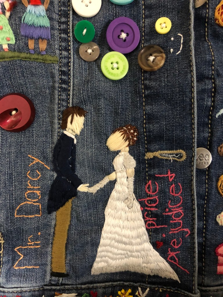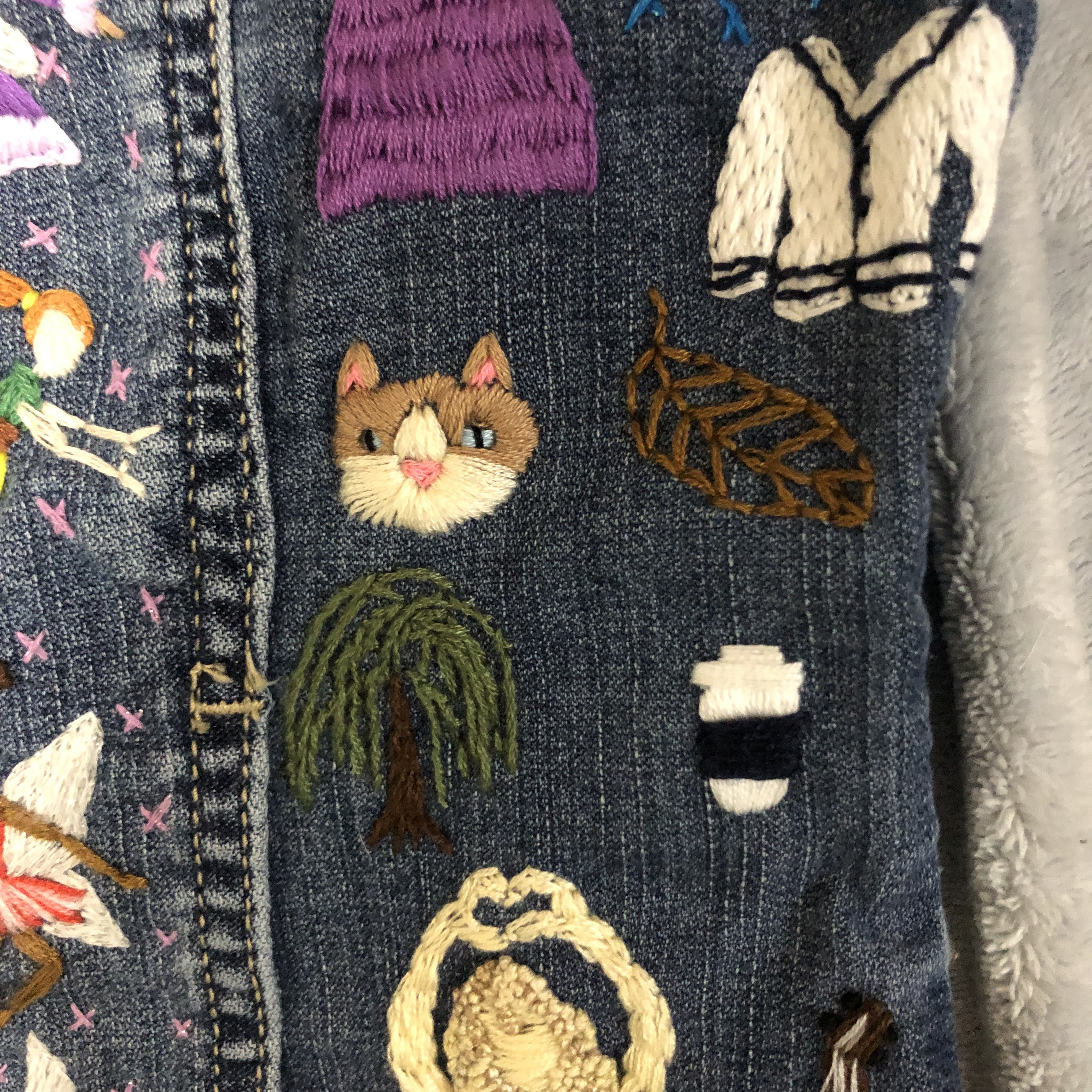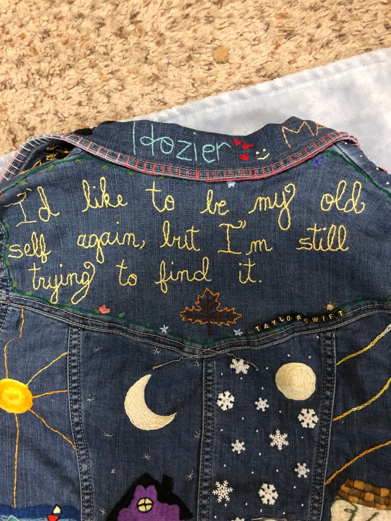 So, one of my big projects this year was embroidering a jean jacket for my little sister. I stitched everything she loves onto it. It really did take me almost all year too. I started it in January 2021, and I finished it and got it mailed to her in early November.