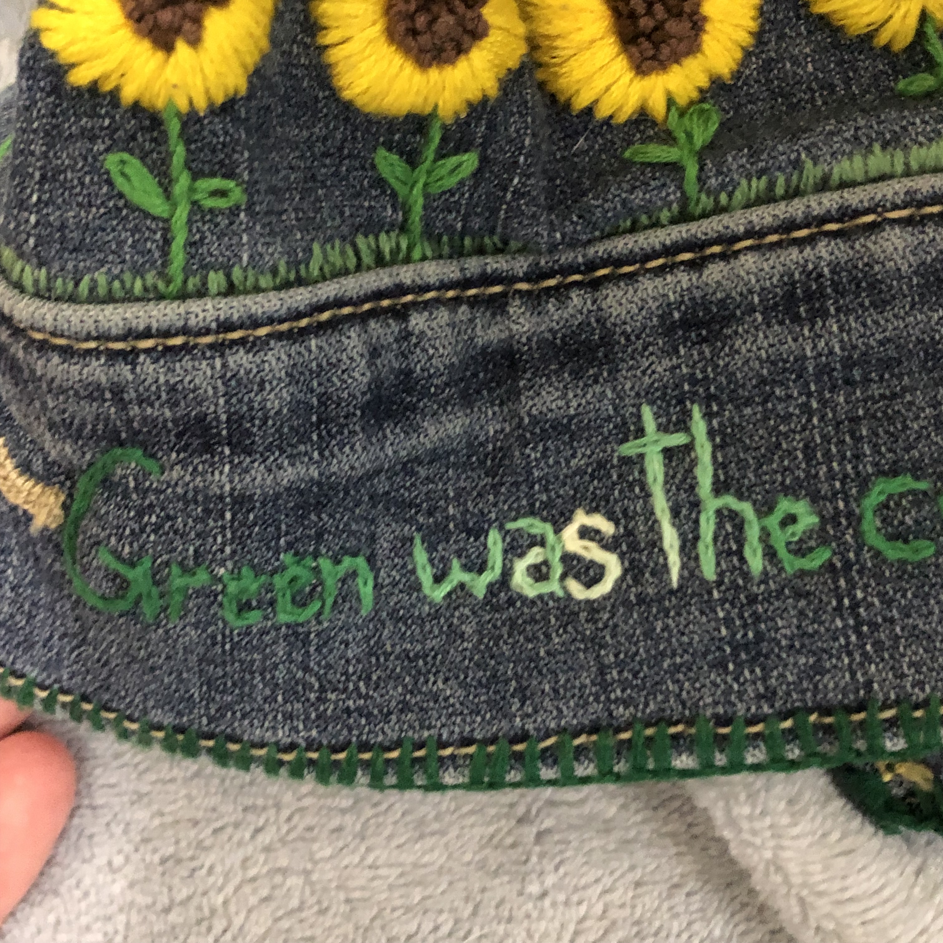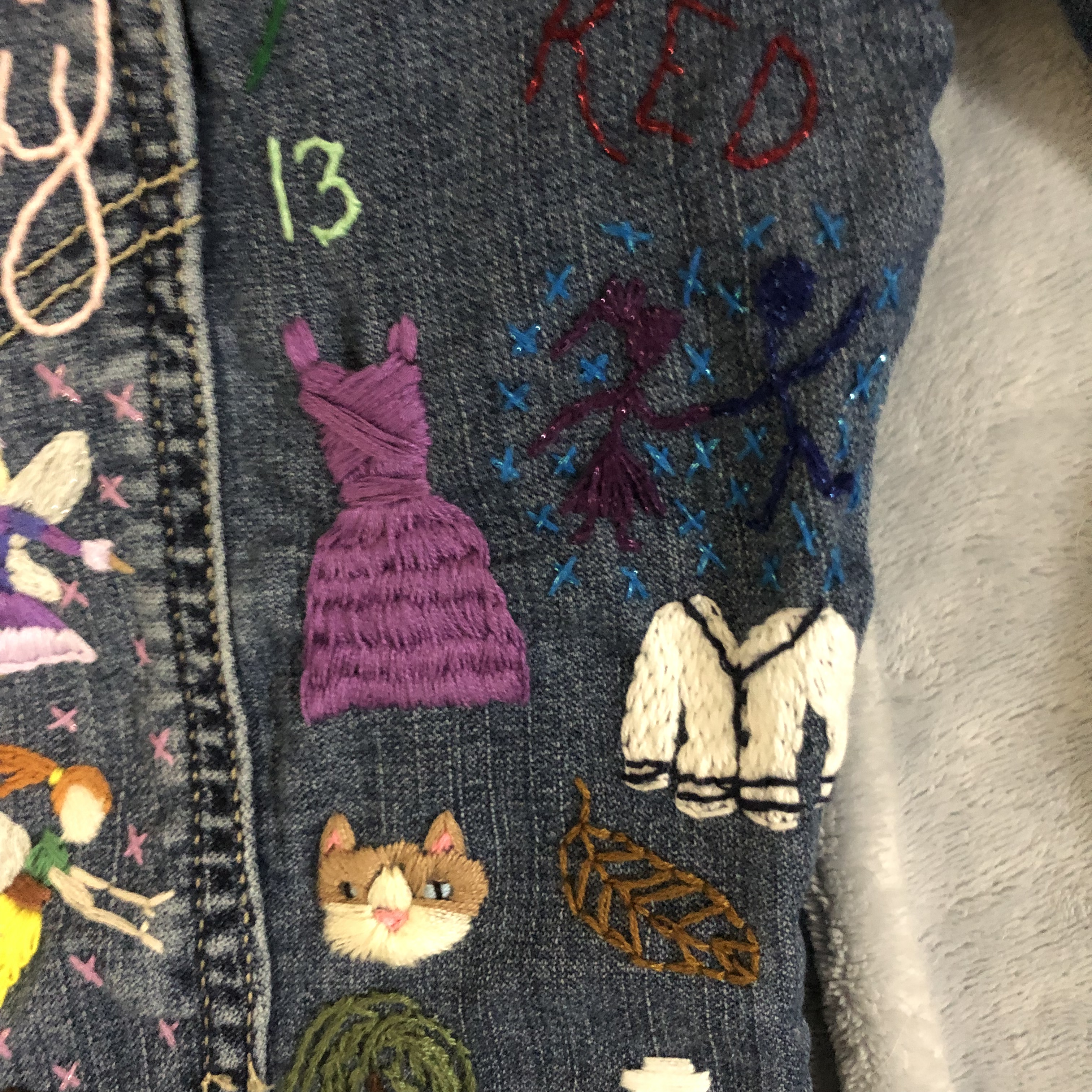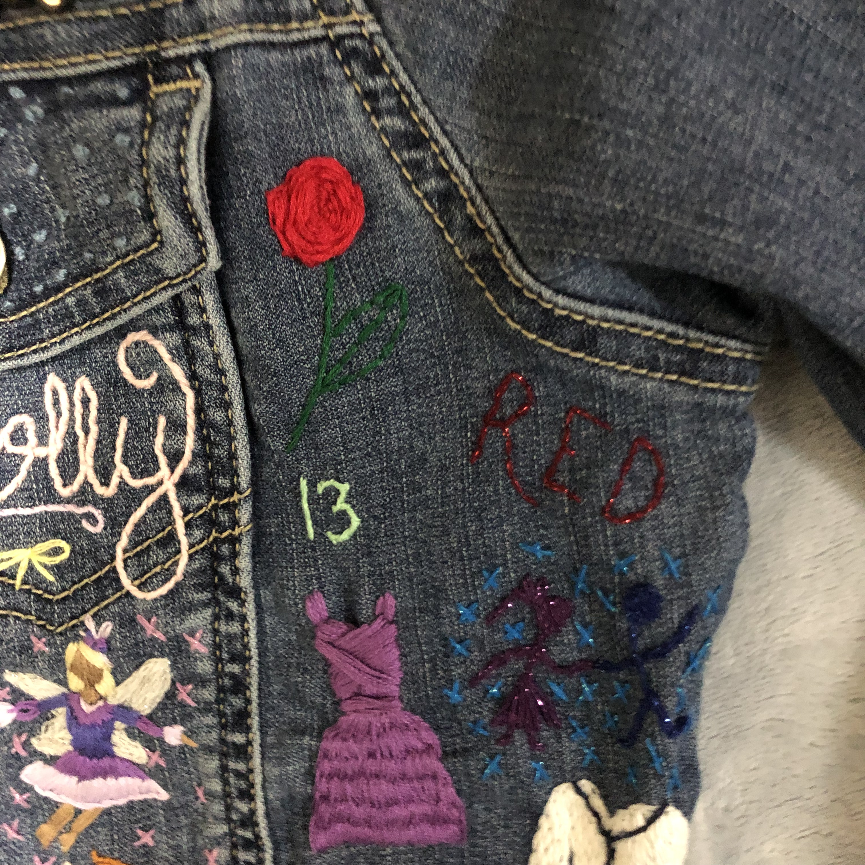 So, one of my big projects this year was embroidering a jean jacket for my little sister. I stitched everything she loves onto it. It really did take me almost all year too. I started it in January 2021, and I finished it and got it mailed to her in early November.