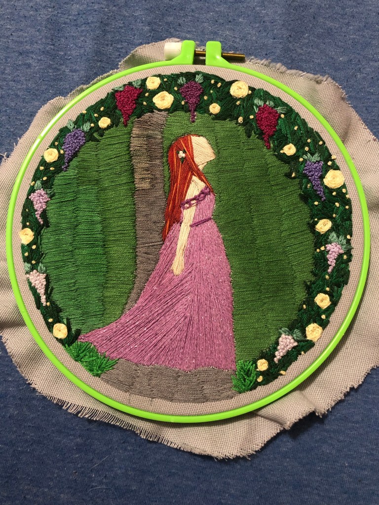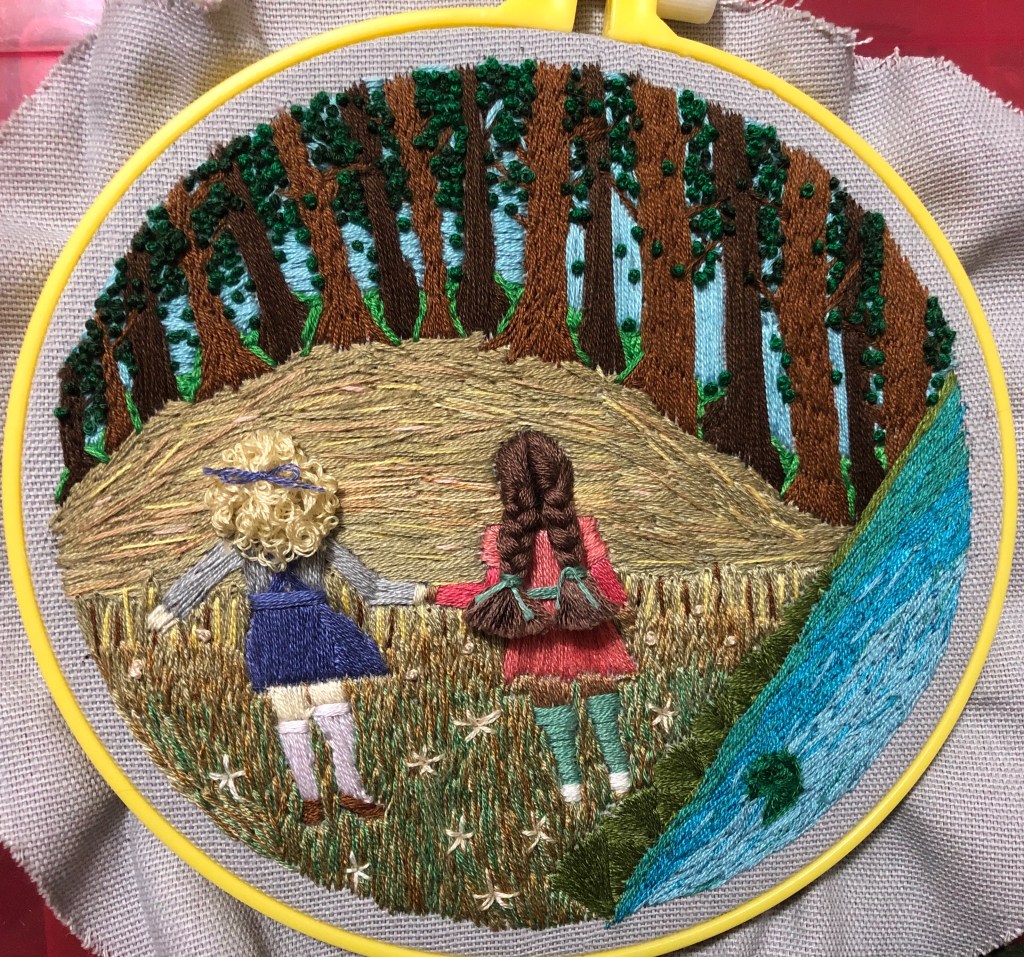 The embroidery piece below was inspired by Seven by Taylor Swift. I relate to that song a lot, and I think the music and lyrics are gorgeous. Their legs kind of blend into the grass, but I think the hair looks nice, especially the curls. It’s been a year since I made this, and they’re still very curly! The water to the side looks terrible, but I’ve decided to process it as a learning experience.