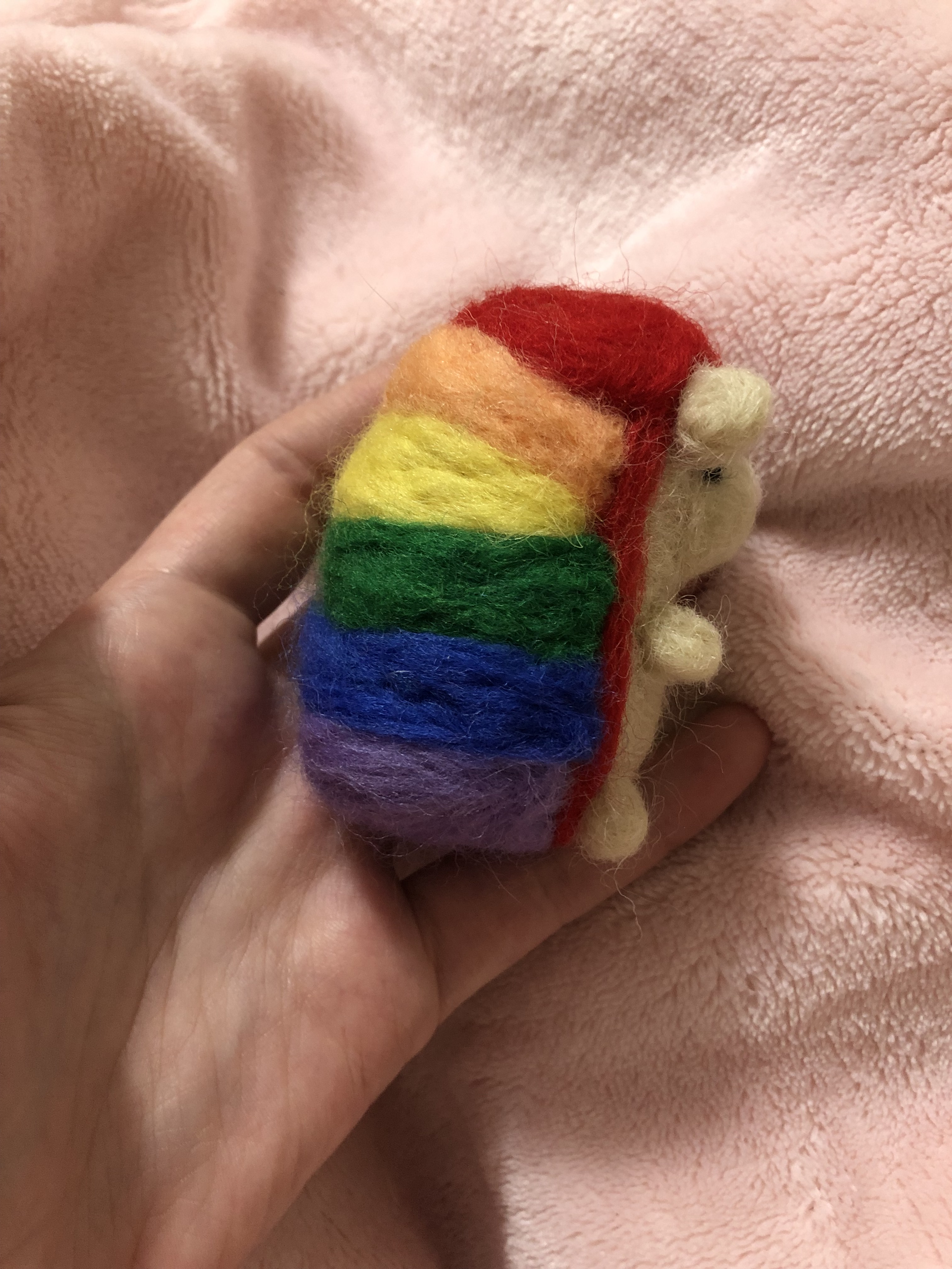I love him. I love mushrooms. I was so happy after I made this because it really gave me the confidence to keep working at needle-felting. I made this rainbow hedgehog/mouse guy next to celebrate Pride Month last June: