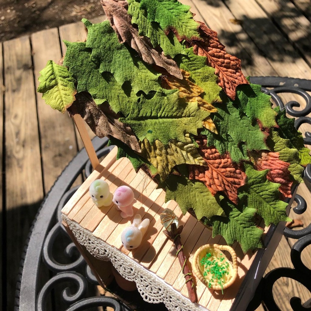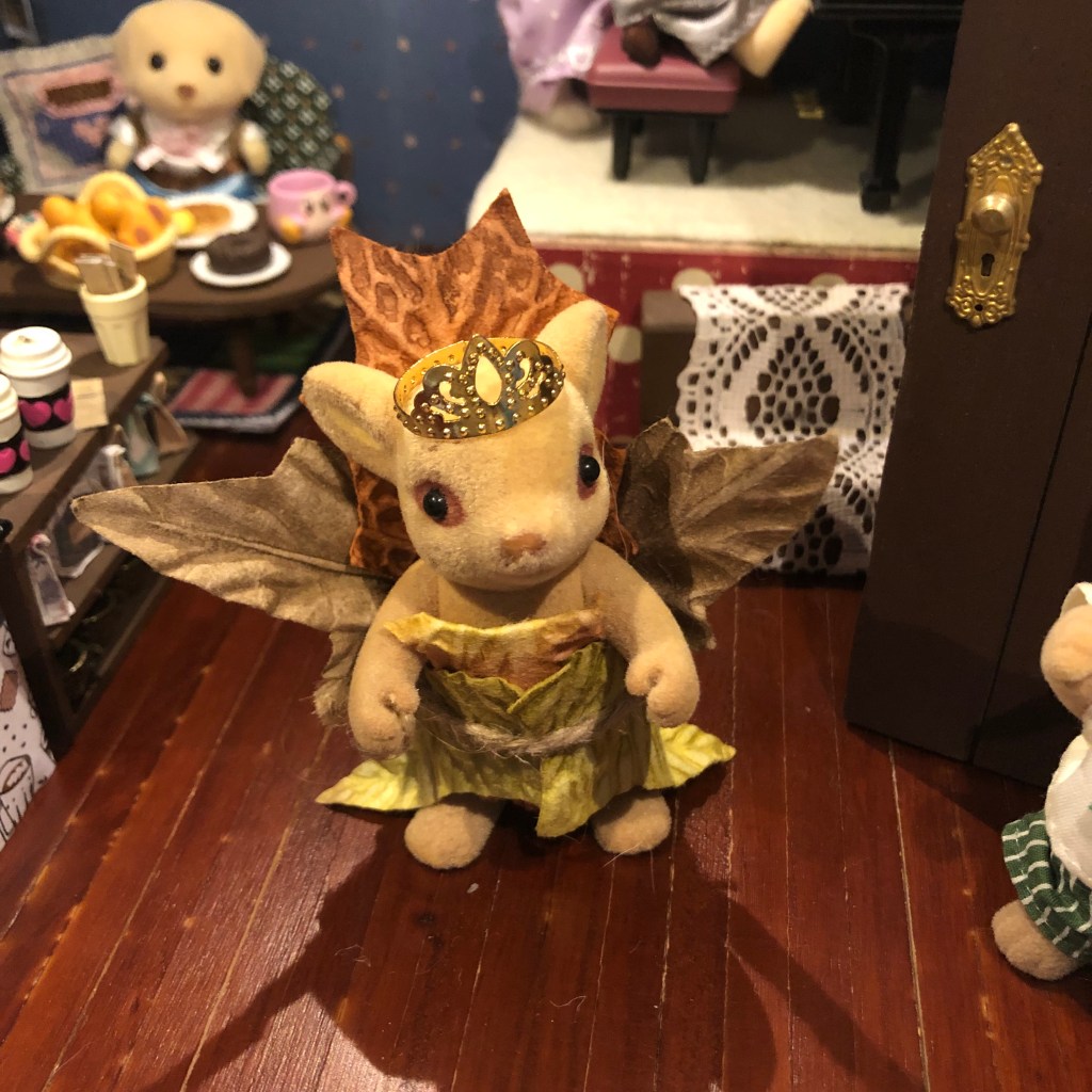 Anyway, onto miniatures! It’s October, which means Mushroom Meadow had to be decorated for autumn and Halloween! First, Mother Deer welcomed autumn in an outfit made of leaves.