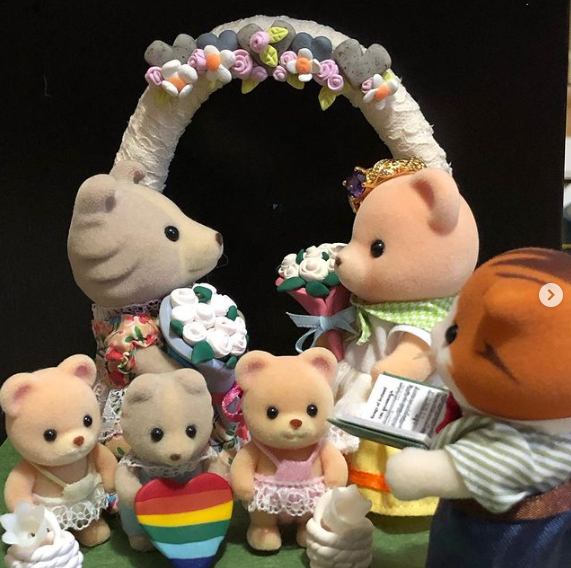 In their dining room, they have a Yule log cake with little mushrooms that I made out of polymer clay.